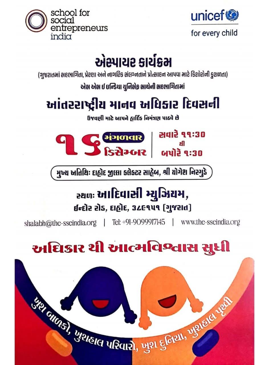 SSE India GIRL UNICEF ગુજરાત તથા મહિલા અને બાળ વિકાસ વિભાગ, દાહોદના સહયોગથી બાલિકા પંચાયત સંમેલનનું તા.૧૬/૧૨/૨૦૨૫ના રોજ આદિવાસી મ્યુઝિયમ, ઇન્દોર રોડ, દાહોદ ખાતે આયોજન કરવામાં આવેલ છે. આંતરરાષ્ટ્રીય માનવ અધિકાર દિવસના અવસરને ધ્યાનમાં રાખીને, આ કાર્યક્રમ બાળ અધિકાર અને બાલિકા નેતૃત્વને કેન્દ્રમાં રાખીને યોજાશે. કાર્યક્રમની થીમ ‘અધિકાર થી આત્મવિશ્વાસ સુધી: A Journey of Empowered Girls” રાખવામાં આવી છે.